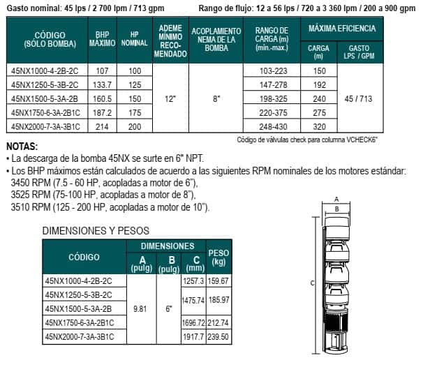 La bomba de tazones 45 LPS de 200 HP, código 45NX2000-7-3A-3B1C Requiere ser acoplada a motores eléctricos sumergibles de 200 HP de potencia con acoplamiento NEMA 8″.