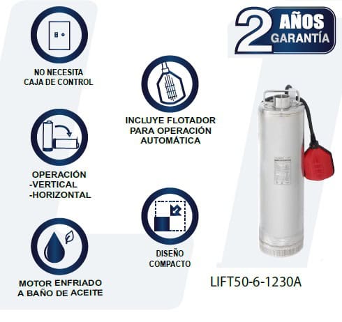 La motobomba sumergible 1.2 HP LIFT50-6-1230A, cuenta con 2 años de garantía contra defectos de fabricación.