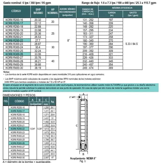Bombas sumergibles serie KOR6, marca Altamira, gasto nominal de 6 LPS, para motores de 20 a 40 HP, descarga de 3″. Construidas en acero inoxidable, impulsores flotantes anti bloqueo. Rango de flujo de 100 a 400 LPM. Rango de carga de 131 a 474 mca.