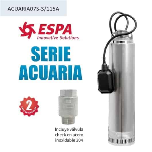 Motobomba sumergible de 1 HP, marca Espa, código ACUARIA07S-3/115A | 1 F, 115 V | descarga de 1″ | Para pozos de 6″ , cisternas, norias, etc.| Rango de carga de 20 a 50 mca | Gasto nominal 7 GPM | Rendimiento: 63 LPM a 20 mca / 8 LPM a 50 mca | Camisa de acero inoxidable | Incluye flotador | Fabricada en España.