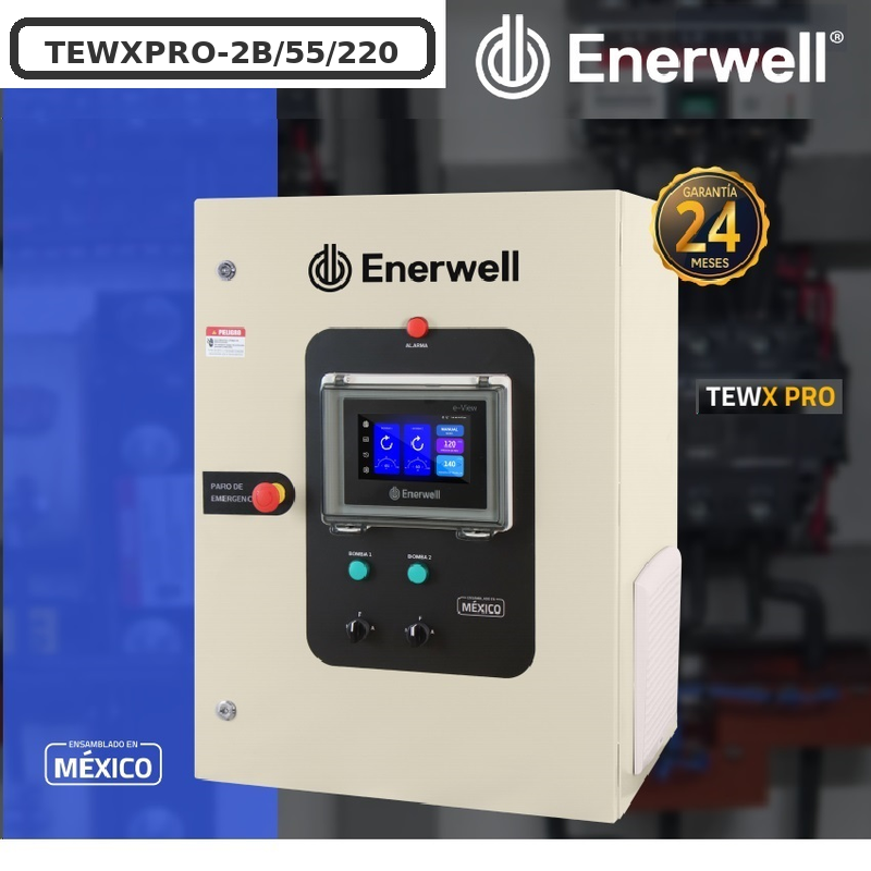 Tablero de control de presión constante Enerwell TEWXPRO-2B/55/220 para 2 bombas de 20 HP 3F/220V | Máximo rendimiento para alta demanda con un variador por bomba. Su sistema de alternancia y simultaneidad asegura presión estable, ahorro de energía y mayor vida útil del sistema.